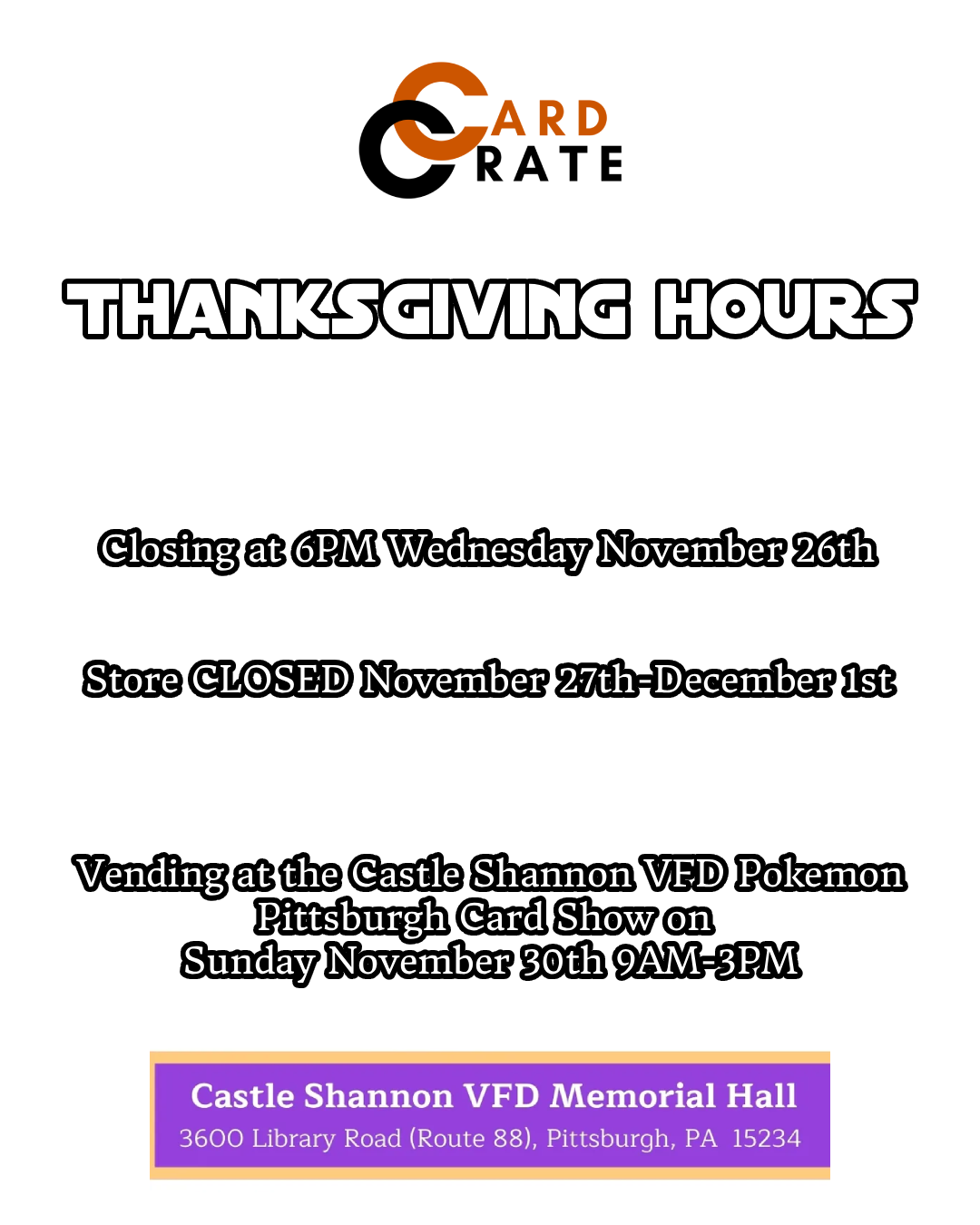 Thanksgiving Hours. Catch us at the Castle Shannon Pokemon Show!